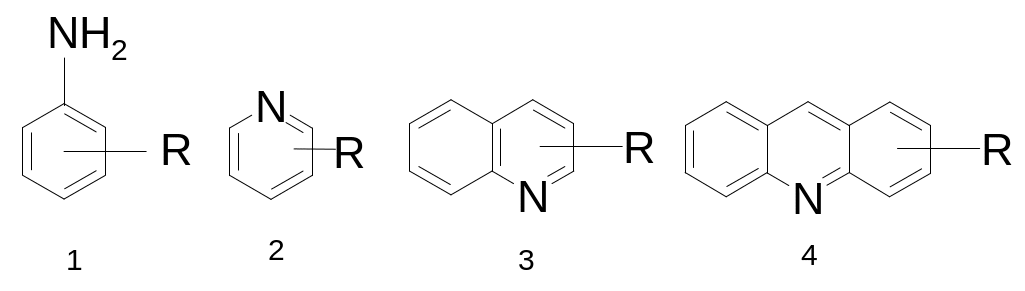 1- Алкиланилин, 2-алкилпиридин, 3-алкилхинолин, 4-алкилакридин.