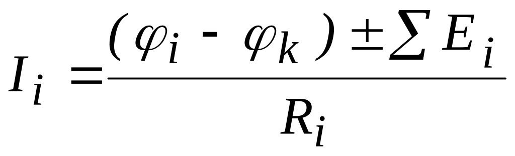 где φi– потенциал узла, от которого течет ток Ii, φк – потенциал узла, к которому подтекает Ii, Еi - величина источника ЭДС i–й ветви (берется со знаком "+", если направление ЭДС Еi совпадает с током Ii и "–" если оно противоположно) Ri - сопротивление i-й ветви. Для цепи синусоидального тока: