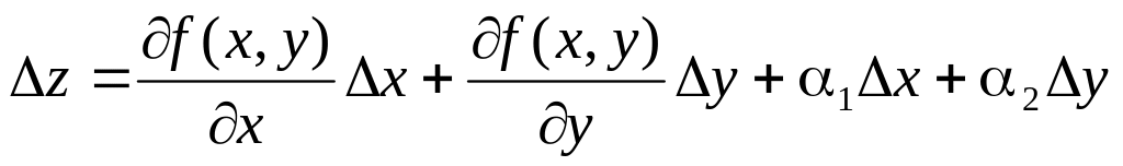 Определение: Полным дифференциалом функции z = f(x, y) называется главная линейная относительно Dх и Dу приращения функции Dz в точке (х, у).