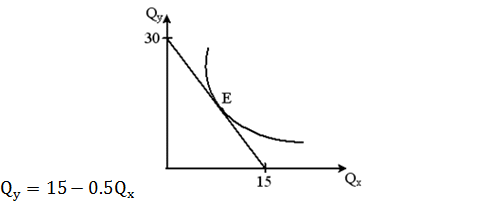 На рисунке показана кривая безразличия потребителя и его бюджетная линия. Если цена товара y равна 5 рублям, то уравнение бюджетной линии будет … Qy = 30 – 2Qх