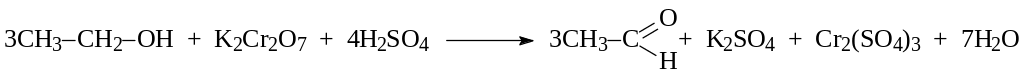 Б) Окисление хромовой смесью. В пробирку наливают 2–3 капли раствора H2SO4, 0,5 мл раствора дихромата калия и добавляют по каплям при встряхивании столько же этанола. Цвет смеси изменяется от оранжево-красного до зеленого.