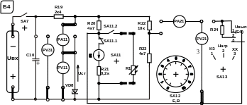 3.4.1 Изучить принцип действия параметрического стабилизатора напряжения и электрическую схему включения стабилитрона на стенде совместно с управляемым выпрямителем и мостовой измерительной схемой без R24 в качестве нагрузки.