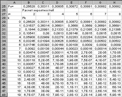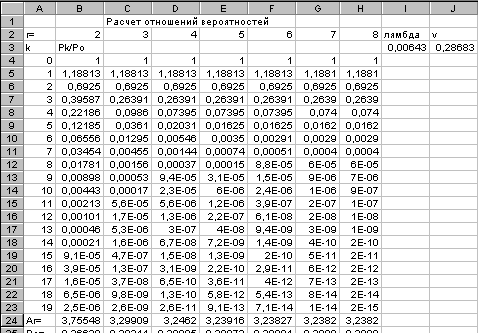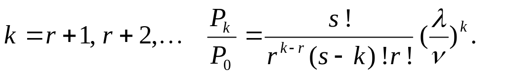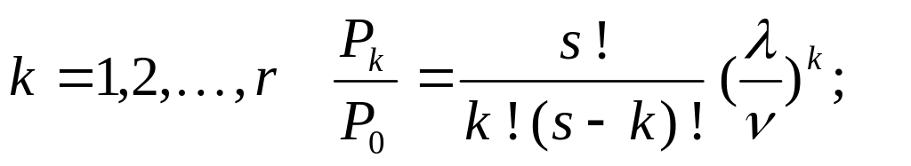 Чтобы получить эти вероятности, предварительно рассчитывают их отношение к вероятности нулевого состояния т.е. вероятности того, что все обслуживающие каналы свободны. Расчетные формулы зависят от числа заявок на обслуживание: