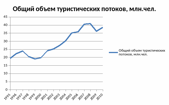 Базисный абсолютный прирост составляет 19,1. Это значит, что показатель объема туристических потов в 2010 выше, чем аналогичный показатель в 1995 году 19,3 млн. чел.