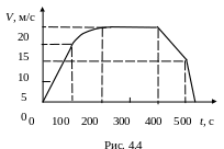 6. Определить по графику зависимости скорости от времени движения V(t) поезда массой 3,6·106 кг на подъеме с уклоном 0,002 силу сопротивления и коэффициент сопротивления в режиме выбега. Определить силу тяги локомотива при равномерном движении (рис.4.4).