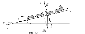 Определим ускорение поезда при торможении всеми колесами поезда. На поезд при торможении действуют следующие силы: со стороны Земли – сила тяжести поезда Мg, включая силу тяжести локомотива mg; со стороны рельсов – касательные сила торможения Fторм всех вагонов и локомотива и сила сопротивления качению поезда Fсопр; нормально со стороны рельсов действует сила нормального давления на колеса локомотива и состава N (рис. 4.3). Внутренние силы в автосцепках между вагонами действуют попарно, взаимно компенсируются и на движение влияния не оказывают.