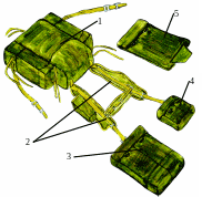 Ремені мають два ватники (на правому пришита кишеня для черенка саперної лопати), грудну перемичку з карабіном, дві пряжки для переведення рюкзака в положення „ під парашут ” та два на півкільця, до яких пристібаюся карабіни кутових стрічок.