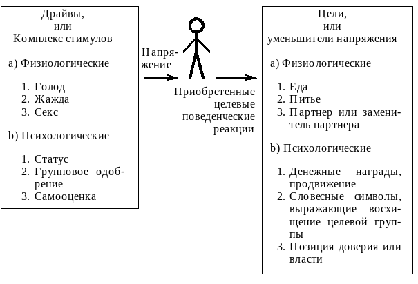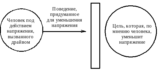 Сложность человеческого сознания очевидна, даже если иметь в виду эти основные биологические драйвы. Некоторые типы еды, хотя и являющиеся адекватными как цели, уменьшающие напряжение, могут быть запрещены некоторыми социальными группами. Даже если конкретная цель известна, приобретенные приемы для достижения этой цели в огромной степени различаются среди отдельных людей и среди обществ. Основная связь между драйвом, человеком и целью схематически показана на рис. 1.