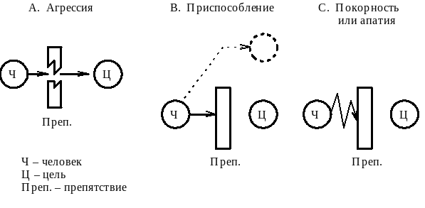 В этой основной ситуации человек в зависимости от того, как он видит эту ситуацию, может реагировать несколькими способами: агрессией, приспособлением или поиском альтернативной цели, и покорностью или апатией.