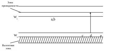 На рис. 3 области, в которых проводимость обусловлена электронами, поступающими в зону проводимости за счет переходов электронов, помеченных буквами a, b, c, d, e, на рис. 4 обозначены теми же буквами.