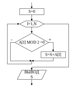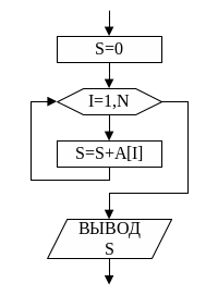 Отсюда видно, что для вычисления суммы элементов массива необходимо использовать цикл, который будет повторять оператор S=S+A[i], где i поочерёдно принимает значения от 1 до N с шагом 1. После завершения N итераций цикла значение суммы будет вычислено окончательно и его можно обработать по условию задачи, например, вывести на экран.