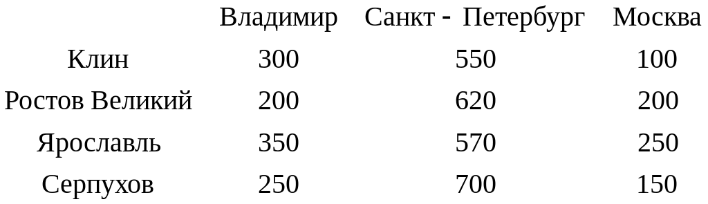 Сейчас 4 автомобиля компании оставлены в Клину, 3 – в Ростове Великом, 6 – в Ярославле и 1 – в Серпухове. Имеются заказы на 5 автомобилей во Владимире, на 3 автомобиля в Санкт-Петербурге и на 6 автомобилей в Москве. Расстояния между городами (в км) приведены в следующей таблице: