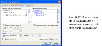 Поместите курсор на место вставки оглавления. Выберите команду Ссылка, Оглавление и указатели в меню Вставка и откройте вкладку Оглавление (рис. 6.12).