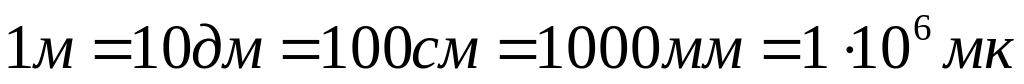 3.1. Длина.Основной единицей длины является метр (м), а в системе СГС—сантиметр (см). Применяются также дольные единицы: дециметр (дм) и миллиметр (мм), а из внесистемных единиц — микрон (мк), причем: