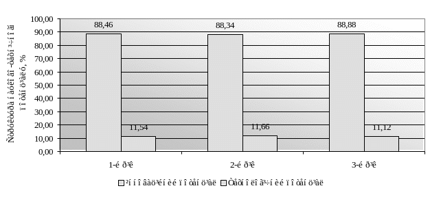 Висновок. Структура науково-технічного потенціалу є достатньо стабільною. Протягом періодів, що аналізуються, спостерігається зростання частки інноваційного потенціалу (на 0,42 % протягом трьох років) та відповідне зменшення частки технологічного потенціалу. Більшу частину в структурі науково-технічного потенціалу становить інноваційний потенціал (88,46 –88,88 % відповідно за періоди).