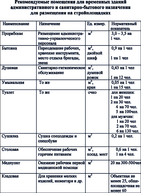 Определение потребности в административных и санитарно-бытовых помещениях. Если в составе ПОС количество трудящихся определяют приближённо через выработку или по укрупнённым показателям, то на стадии ППР эта численность уточняется в соответствии с календарными планами работ и графиками движения рабочей силы. Расчёт площадей бытовок и помещений для сушки одежды производится по максимальному пребыванию рабочих на строительной площадке в сутки, включая и рабочих субподрядных организаций. Если на строительной площадке отсутствуют стационарные бытовки, то место для размещения бытовых помещений должно принять количество бытовок контейнерного типа равное максимальному количеству бригад, предусмотренных в календарном плане работ и графике движения рабочей силы. Расчёт остальных санитарно-бытовых помещений (душевых, умывальных, столовых, буфетов, медпунктов и проч.) производится от максимального пребывания рабочих в смену.