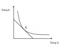 Бюджетная линия представляет собой прямую линию с отрицательным наклоном, графически отражающую множество наборов из двух товаров, требующих одинаковых затрат на их приобретение. При данном уровне цен потребитель предпочитает максимальный уровень удовлетворения своих потребностей из предложенного набора. Точка равновесия – это точка касания бюджетной линии с кривой безразличия, отражающая максимально возможную полезность при данном ограниченном доходе (точка Х) (рис.4.4).