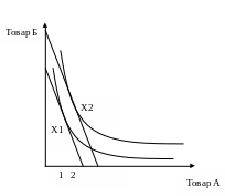 Реакция потребителя на изменение цен в экономической модели поведения потребителей называется эффектом замещения. Эффект замещения – это сохранение достигнутого уровня потребления с изменением цен при неизменном уровне дохода. При эффекте замещения бюджетная линия меняет угол наклона (рис.4.5). Снижение цены на товар А приведет к перемещению точки 1 бюджетной линии к точке 2 и смещению точки равновесия от Х1до Х2.