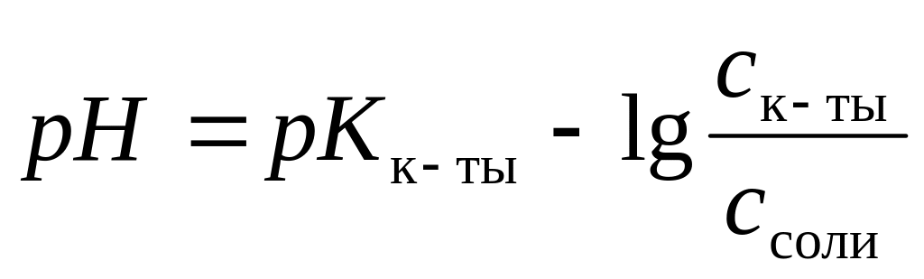 Логарифмирую полученное выражение и меняя знаки на обратные, получаем необходимую формулу, позволяющую вычислить рН в буферных смесях из слабых кислот и их солей: