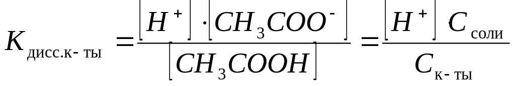 высокая концентрация CH3COO- иона практически нацело подавляет диссоциацию слабой уксусной кислоты. Вследствие этого равновесную концентрацию недиссоциированных молекул уксусной кислоты можно считать равной ее исходной молярной концентрации [CH3COOH]равн = Ск-ты.
