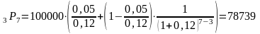 Пример 5.2. В настоящий момент времени выпущена купонная облигация номиналом рублей, сроком погашения через 7 лет и купоном 5% годовых, выплачиваемых ежегодно в конце года от момента выпуска. Необходимо определить начальную цену облигации и ее рыночную стоимость через 3 года, если ее доходность к погашению одинакова и равна 12% годовых.