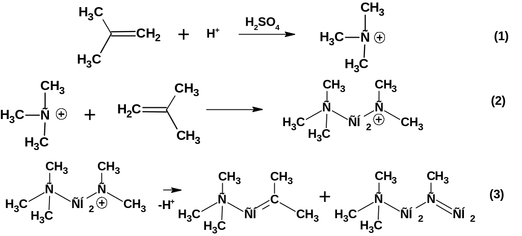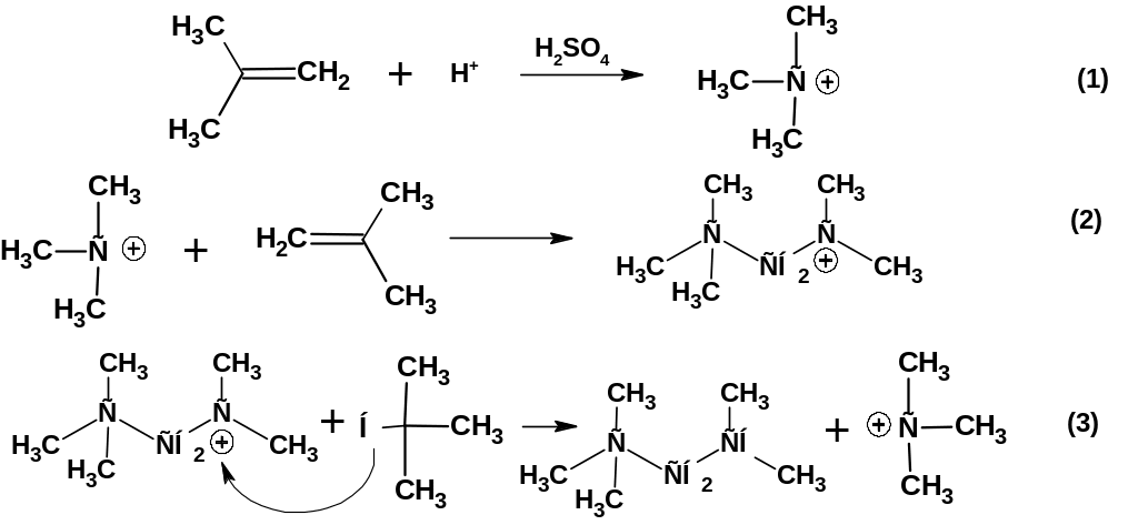 В результате реакции получается 2,2,4-триметилпентан имеющий тривиальное название – изооктан. Это высокооктановое моторное топливо. Используется в качестве стандарта при определении октанового числа бензинов. Алкилирование олефинов протекает как электрофильное присоединение, где в качестве электрофильной частицы выступает третичный карбкатион, присоединяющийся по правилу Марковникова, а в качестве нуклеофила гидрид-анион (анион водорода Н-).