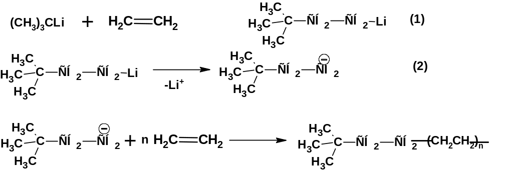 Анионная полимеризация инициируется присоединением нуклеофила по двойной связи. Простые алкены реагируют с сильными нуклеофилами. Например полимеризация этилена в присутствии трет-бутилата лития: