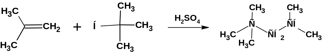 Примером является алкилирование олефинов алканами в присутствии кислот. Например алкилирование изобутилена изобутаном в присутствии серной и фосфорной кислоты: