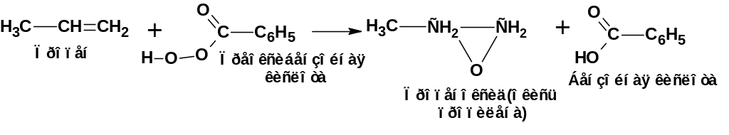 Остальные олефины эпоксидируются действием пероксикарбоновых кислот или просто надкислот (реакция Прилежаева). Пероксикарбоновые кислоты содержат перекисную структуру «О-О», которая отдает один атом кислорода двойной связи: