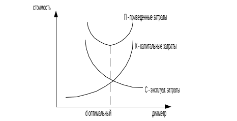 Диаметр определяется по расчетному расходу воды на участке. По условиям эксплуатации скорость не должна превышать 2,5 – 3 м/с, то есть любые скорости от минимальной до 2,5 м/с могут быть приемлемыми, и вопрос назначения диаметра при приемлемых скоростях это вопрос экономический. При увеличении диаметра возрастают капитальные затраты, но снижаются скорости, следовательно уменьшаются потери напора и как следствие уменьшаются расходы электроэнергии на перекачку жидкости т.е. снижаются эксплуатационные затраты.