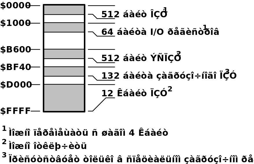 Размер адресуемого процессорным модулем пространства равен 64 Кбайтам.