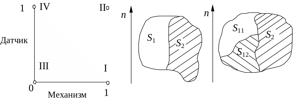 В полностью определенной среде управление задано для всех комбинаций признаков среды. Например, включается и отключается некоторый механизм с датчиком аварии. Состояние среды характеризуетcя наличием или отсутствием сигнала с датчика аварии, а состояние объекта – работой или остановкой механизма. Для двух бинарных признаков возможны только 22 = 4 ситуации (рис. 1.2, а): I – механизм работает, аварии нет; II – механизм работает, авария есть; III – механизм не работает, аварии нет; IV – механизм не работает, авария есть. В каждой ситуации может быть принято одно из трех решений: для I и IV – ничего не предпринимать; для II – отключить механизм; для III – включить механизм. Управление такого типа реализовано в программных роботах и системах защиты механизмов от перегрузки.