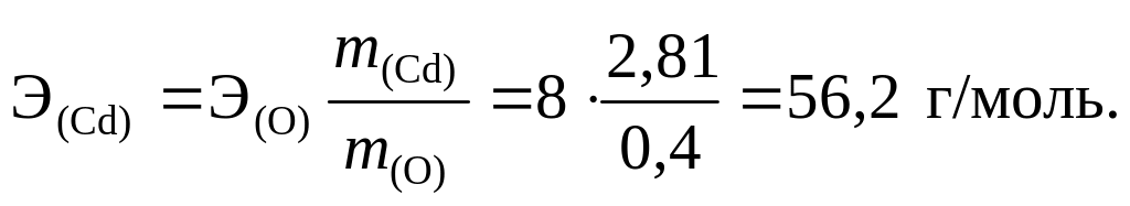 Пример 4. При окислении 2,81 г кадмия получено 3,21 г оксида кадмия. Вычислить эквивалентную массу кадмия и определить его валентность.