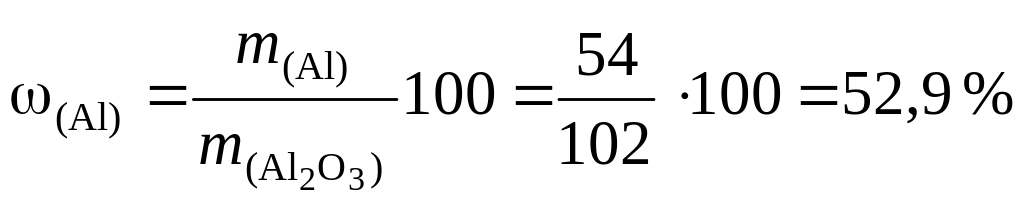 Примем количество вещества Al2O3 равным 1 моль, тогда количество вещества алюминия будет равно 2 моль. Масса оксида алюминия составит 102 г, а масса алюминия 227 = 54 г. Вычислим массовую долю алюминия в его оксиде:
