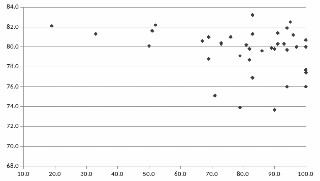 Сравнив средние значения результативного признака по группам, можно увидеть следующую тенденцию: чем выше доля в общем объеме поставок сжигаемых видов топлива, тем выше ожидаемая продолжительность жизни при рождении, т. е. можно предположить наличие прямой корреляционной зависимости между признаками.
