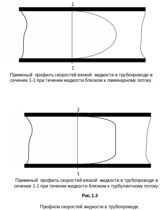 При движении вязкой жидкости вдоль твердой стенки, например, в трубопроводе, вследствие влияния вязкости жидкости и действия сил молекулярного сцепления со стенкой происходит торможение потока жидкости. Поэтому наибольшее значение скорость жидкости ( v ) имеет в центре сечения (рис.1.3). По мере приближения к стенке скорость жидкости уменьшается практически до нуля. Неравномерность распределения скоростей означает скольжение одних слоев жидкости по другим, вследствие чего в потоке возникают касательные напряжения трения. Кроме того, движение жидкости в каналах гидроприводов сопровождается вихреобразованием и перемешиванием. Указанные факторы приводят к потерям энергии потока жидкости. На практике при расчете гидравлических цепей в рассмотрение вводится средняя по сечению скорость жидкости (vср), а также среднее значение удельной энергии в сечении потока.