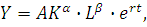 где Y – продукт (объем производства); К – капитал; L – труд; А – коэффициент пропорциональности или масштабности; α,β – коэффициенты эластичности объема производства соответственно по капиталу и труду, т.е. коэффициенты, характеризующие прирост продукта, приходящийся на 1% прироста соответствующего фактора производства; ert - фактор, отражающий влияние качественных изменений в производстве, в том числе технический процесс.