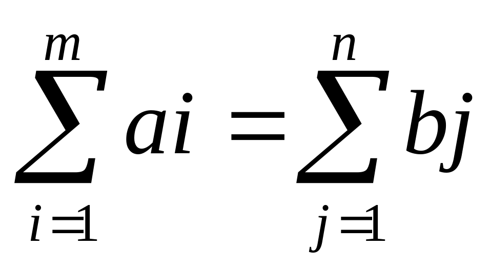 Пусть имеется m пунктов отправления (или пунктов производства) А1, А2, ..., Аm и n пунктов назначения (потребления) B1, B2, ..., Вn. Обозначим ресурсы груза в i-м пункте отправления через ai, (i=l,…,m), а потребности каждого j-ro пункта потребления через bj (j=l,…,n). Известна стоимость доставки единицы груза от каждого i-ro пункта отправления до каждого j-ro пункта назначения -сij,. Будем предполагать, что общее количество грузов, имеющихся на пунктах отправления равно потребности в нём на пунктах назначениях, т.е. имеется следующее соотношение: