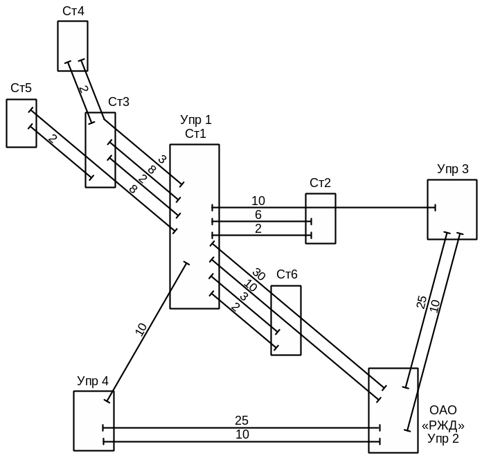 При разработке схемы каналов в соответствии с заданием (см. рис.1) на ней изображают в виде прямоугольников административные пункты, между которыми необходимо организовать связь (ОАО «РЖД», управления дорог Упр1,…,Упр4 и узловые станции Ст1,…,Ст6, на которых ранее до реорганизации структуры управления размещались отделения дорог).