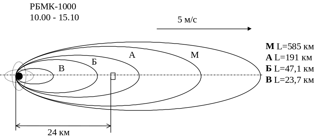 4. Виходячи із заданої віддалі об’єкта народного господарства (Rх=24 км) до аварійного реактора з врахуванням утворених зон забруднення встановлюємо, що об’єкт опинився на внутрішній межі зони “Б”.