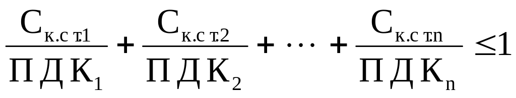 Как правило, водоем загрязняется несколькими ингредиентами. Поэтому оценивается комбинированное воздействие загрязняющих веществ, относящихся к одной группе по лимитирующему показателю вредности (ЛПВ). Для всех веществ при рыбохозяйственном использовании и для веществ 1 и 2 классов опасности при хозяйственно-питьевом и культурно-бытовом водопользовании сумма отношений концентраций загрязняющих веществ в контрольном створе (Cк.ст.) к их ПДК должна быть меньше или равна единице.