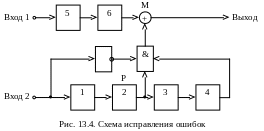 Автоматическая операция исправления последовательности, возникающей на Выходе 1 декодера с помощью исправляющей последовательности на Выходе 2 (см. рис. 13.3), осуществляется с помощью схемы исправления ошибок, приведенной на рис. 13.4. Эта схема является продолжением схемы на рис. 13.3 (Выход 1 соединяется с Входом 1, а Выход 2 с Входом 2).