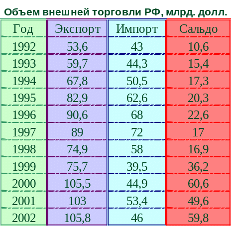 Развитие российской внешней торговли в пореформенные годы характеризую данные Таблица 3 (о местоположении данной таблицы всем своим видом говорит Рисунок_Paint) . Они свидетельствуют о резком спаде внешнеторгового оборот в первые два года реформ. При сокращении за это время российского ВВП примерно на 30% против 1991 г. внешнеторговый оборот уменьшился вдвое, а с бывшими союзными республиками – втрое. В дальнейшем в 1994 – 1997 гг. происходил некоторое увеличение экспорта и импорта, однако темпы роста последнего были более низкими.