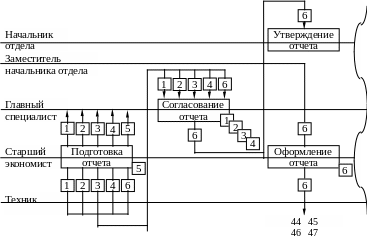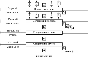 Далее строится схема принятия решений в подразделении. Она представляет собой структурную "фотографию" всех процессов подготовки и принятия УР, которые осуществляются в данном подразделении. Для этого вычерчиваются горизонтальные линии в количестве, равном наименованию должностей данного подразделения по штатному расписанию. Каждая линия соответствует определенной должности. Так образуются уровни управления. Затем на эти уровни в порядке, указанном функциональной блок-схемой, наносятся схемы всех организационных процедур, действующих в подразделении. В данном случае таких процедур будет пять (столько, сколько было выбрано для анализа), поэтому правомерно говорить о фрагменте схемы принятия решений.