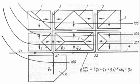 На схеме 1 приведен пример определения расчетных расходов на участке сети.