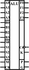 Арифметико-логическое устройство (АЛУ) – это многофункциональное устройство, которое выполняет над входными числами различные арифметические и логические операции. УГО АЛУ приведено на рис. П.6.1.