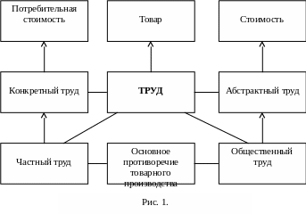 Это противоречие заключается в том, что, во-первых, труд каждого товаропроизводителя, в силу общественного разделения труда, носит общественный характер, а значит, товаропроизводители производят продукты не для себя, а для других, т. е. для обмена. В этом смысле их труд приобретает общественный характер, т. е. характер труда для общества. Но действительно общественным характер труда каждого товаропроизводителя является лишь в том случае, и это необходимо подчеркнуть, если он расходует свой труд в пропорциях, соответствующих пропорциям общественных потребностей. Предположим, что обществу для удовлетворения своих потребностей необходимо 5 млн. тонн пшеницы. Между тем, производители, не зная потребностей общества в пшенице, произвели 6 млн. тонн, т. е. затратили больше труда. Как это отразится на стоимости пшеницы? В данном случае лишь то количество пшеницы, которое необходимо для удовлетворения потребности общества, будет носителем стоимости и представлять общественный труд, а избыточное количество пшеницы окажется излишним и, следовательно, не будет обладать стоимостью. Стоимость товара не просто затраты труда, а затраты, осуществленные в пропорции, которая определяется потребностью общества. Однако в том то и дело, что эта общественная природа его труда не обнаруживается непосредственно в самом процессе производства, так как этот процесс осуществляется отдельными, изолированными друг от друга производителями, труд которых выступает непосредственно как частный. Они заранее не знают общественных потребностей в данном продукте, т. е. ведут производство на неизвестный рынок неизвестного потребителя. Поэтому это противоречие между общественным и частным трудом разрешается в процессе обмена, когда, например, производителю пшеницы противостоит на рынке другой товар, обмен на который подтверждает общественный характер труда производителя пшеницы. Следовательно, в процессе этого обмена и обнаруживается, что труд производителя пшеницы оказывается количественно сравнимым и равным труду производителей других товаров, обмениваемых на пшеницу. Тем самым в товарном производстве общественный характер труда товаропроизводителя проявляется не в самом процессе производства, а лишь на рынке, в процессе обмена. Может показаться, что и стоимость товара возникает на рынке. Но в том то и суть вопроса, что стоимость создается в процессе производства, но обнаруживается, проявляется лишь в процессе обмена, посредством которого вскрывается общественная потребность. Итак, двойственная природа товара, наличие у него двух сторон – потребительной стоимости и стоимости – обусловлена двойственным характером труда товаропроизводителя, труд которого выступает одновременно как труд конкретный и абстрактный. А эта двойственность является формой выражения основного противоречия товарного хозяйства, которое можно проиллюстрировать следующей схемой (рис. 1).