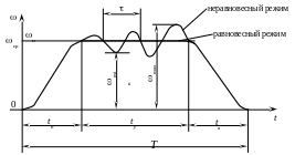 Режимы работы принято изображать в виде графика зависимости угловой скорости входного звена от времени, называемый тахограммой (рисунок 5.2). На тахограмме на рисунке 5.2, режим пуска обозначен, как tп.
