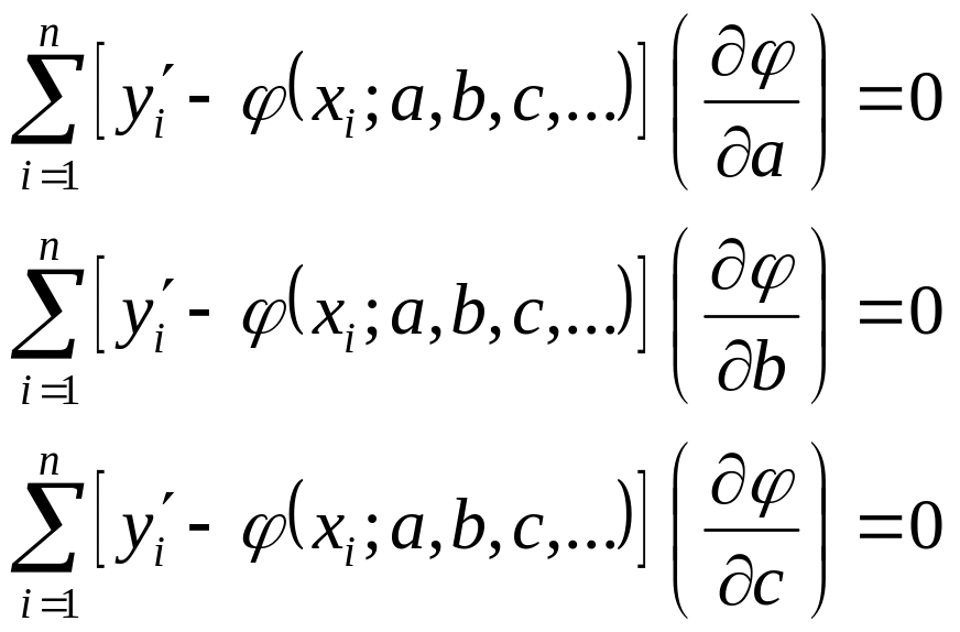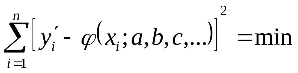 Пусть экспериментальная величина y′ имеет следующие значения: y1′, y2′, …yi′,… yn′, а общий вид функции, зависящий от нескольких числовых параметров a, b, c, … может быть записан как