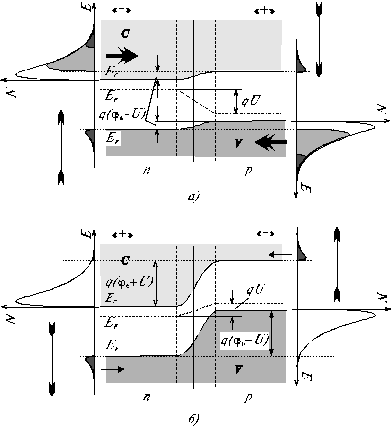 На рис. 5.1 представлена типичная энергетическая диаграмма p‑n-перехода в равновесном состоянии (без внешнего электрического поля). На этом же рис. показано распределение носителей заряда. Как видно, для основных носителей заряда (дырок для p-области и электронов для n-области) существует потенциальный барьер высотой q0, для неосновных же носителей потенциального барьера не существует, и они проходят через p‑n‑переход беспрепятственно.